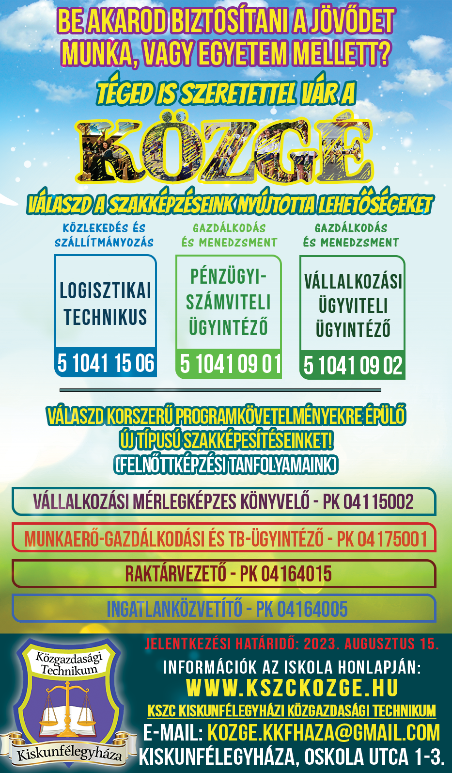 Ha felvesznek, ha nem, a Közgé - Kiskunhalasi SZC Kiskunfélegyházi Közgazdasági Technikum lehetőséget nyújt, hogy több lábon állj, és szerezz szakmát nappali vagy esti képzésben!!!! 2023.07.27-08.02 szakmai oktatóink várnak személyesen 8.30-14.00 óra között az Oskola utcában