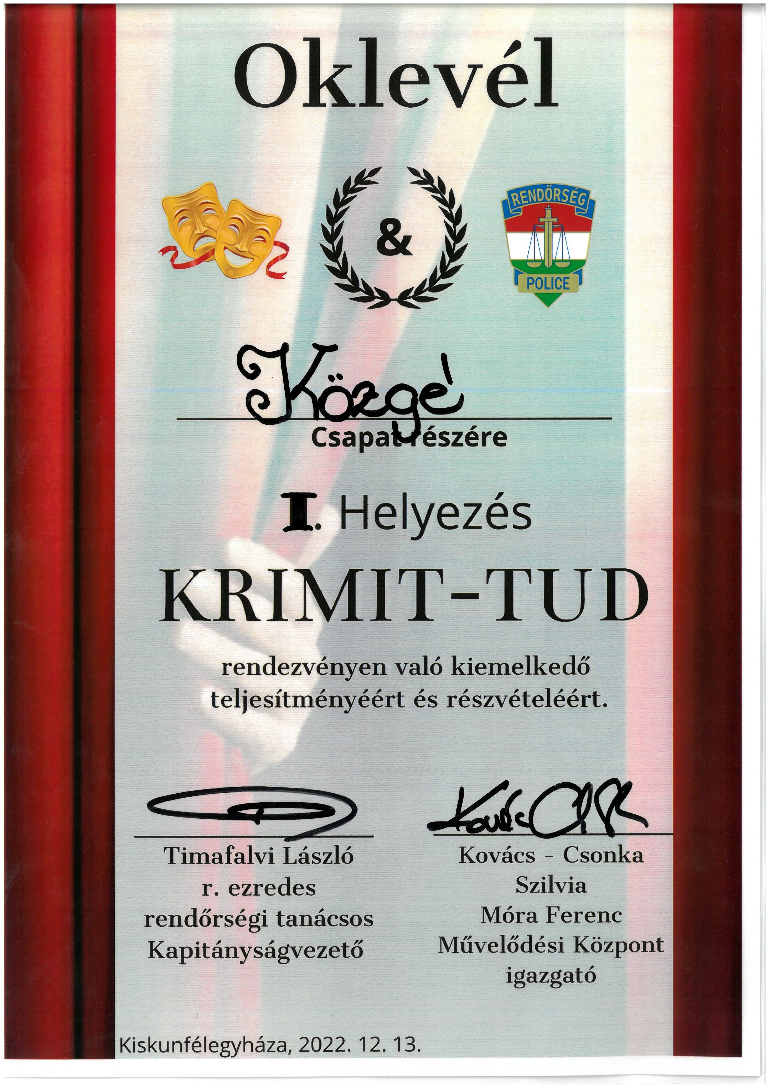 A Közgé csapata (Barcsa Enikő 11/P; Borsos Donát 11/P; Peregi Panna 11/L; Varga Rita 11/T) 1. helyezést ért el a Kiskunfélegyházi Rendőrkapitányság és a Móra Ferenc Művelődési Központ által szervezett városi KRIMIT-TUD vetélkedőn.